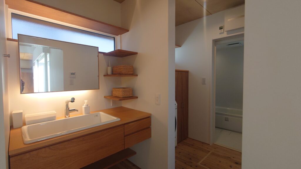 洗面脱衣所には型ガラス(半透明)を採用することで視線に配慮しながらほんのり自然光を取り入れる仕様にしています。