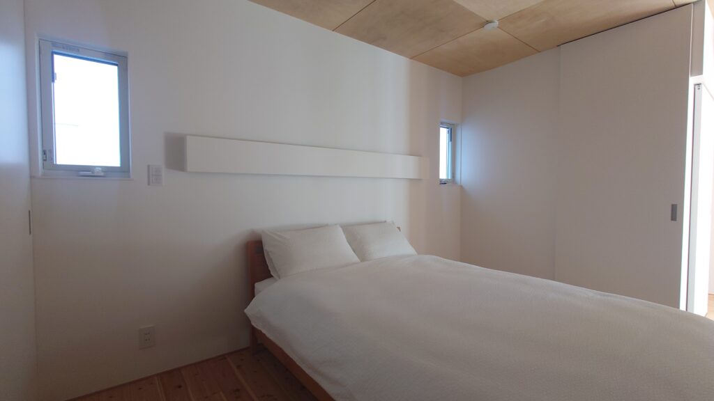 主寝室は「夜寝る時間しか過ごさない」という暮らし方から敢えて小さな窓でアパート側に計画しました。