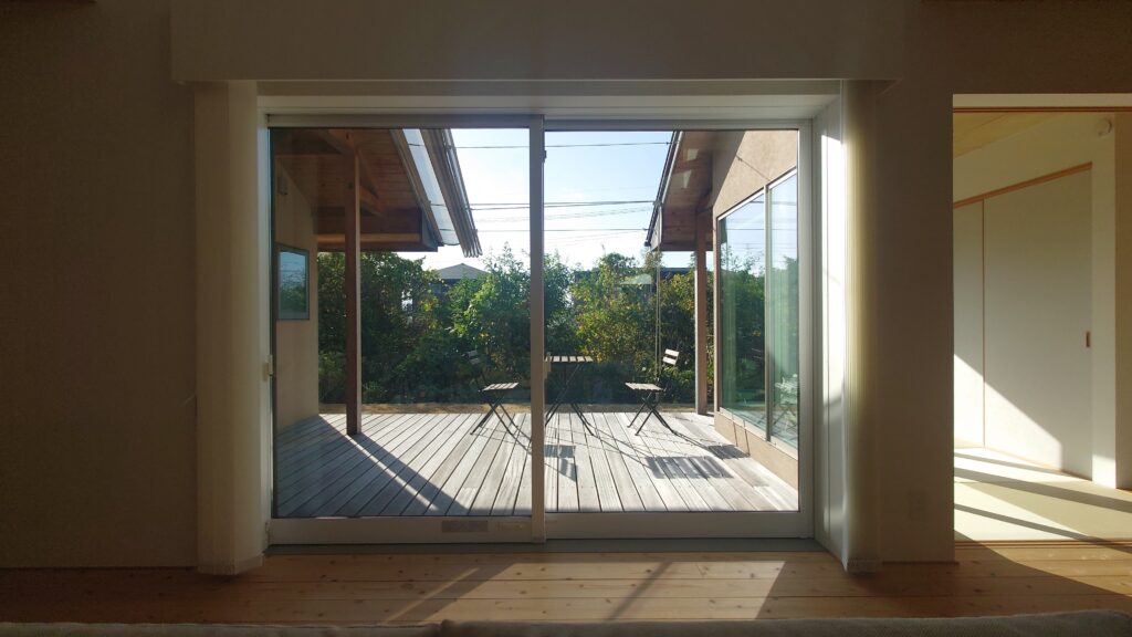 建物は南側が欠けたコの字型で南側に大きなデッキがあります。