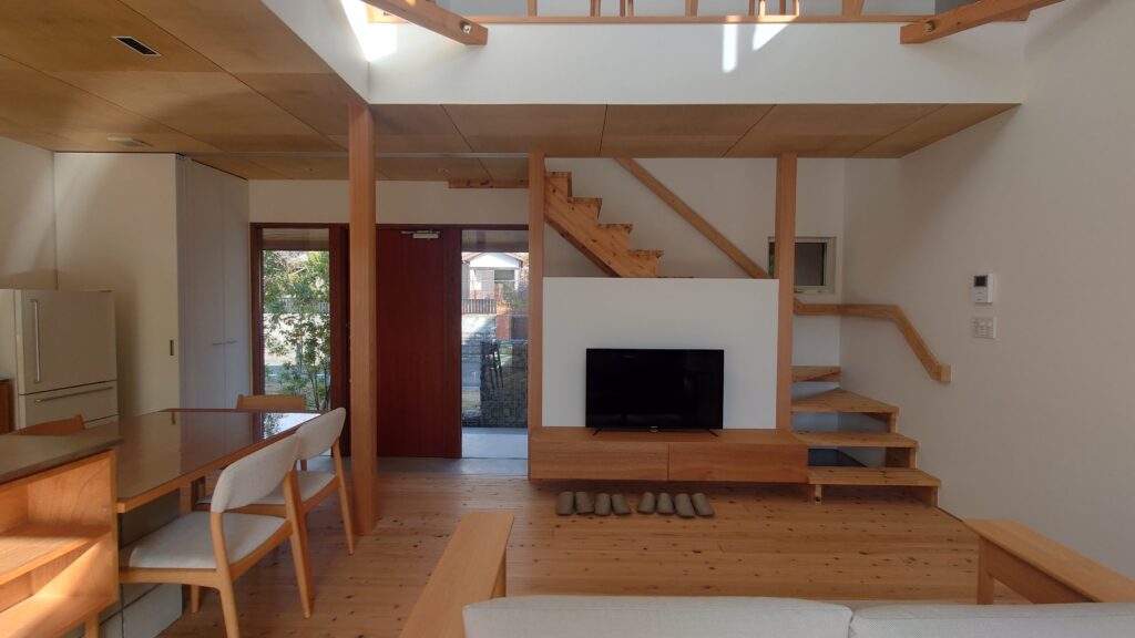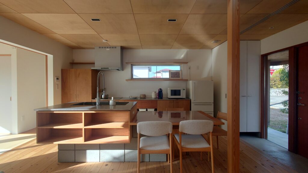 売地側は将来隣に住宅が建つことと、西側であることから窓はキッチンに細長い窓一つだけを設けています。