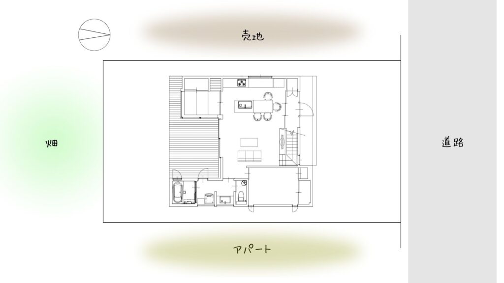 日当たりが良く人が通らない畑側にはLDKと畳スペースを計画。