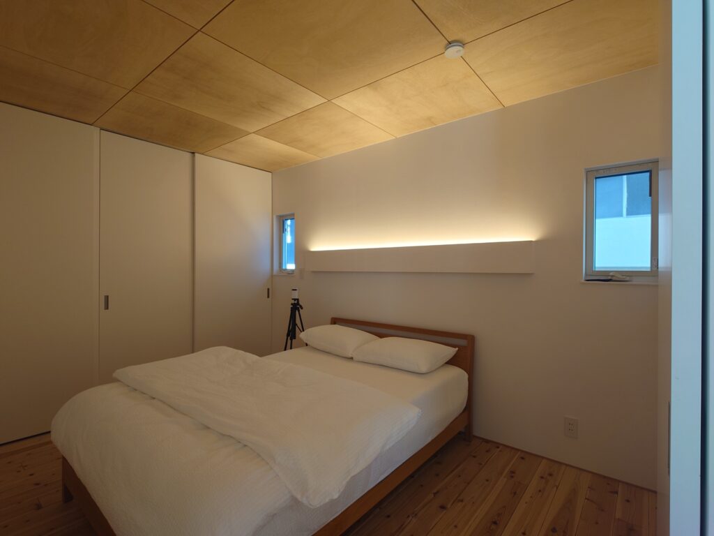 モデルハウスの寝室の東側は建物が建っており朝日が入らない場所なので、主寝室は「夜に寝るための部屋」と割り切って計画しました。