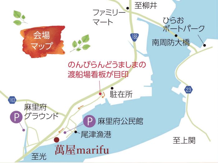 駐車場は麻里府グラウンドか、麻里府公民館をご利用ください。